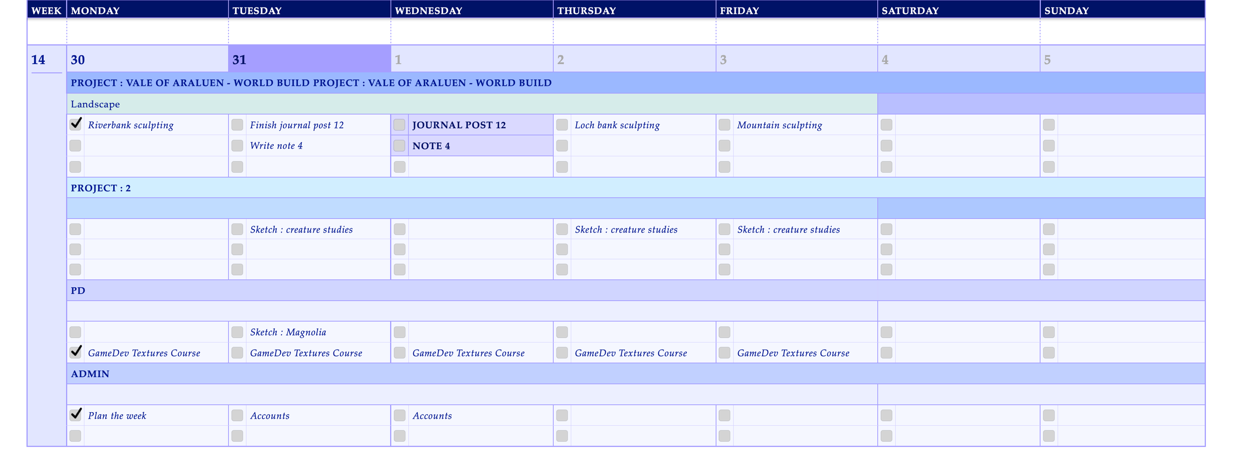 So over the last three weeks alongside all my landscape sculpting I’ve built my own project management spreadsheet (which is much more pleasing to my artist sensibilities as it is a lot more colourful!) There are multiple sheets in my spreadsheet, but I won’t bore you with them all, I’ll just show you a screenshot of a week from the weekly planner sheet to give you the general gist so to speak.